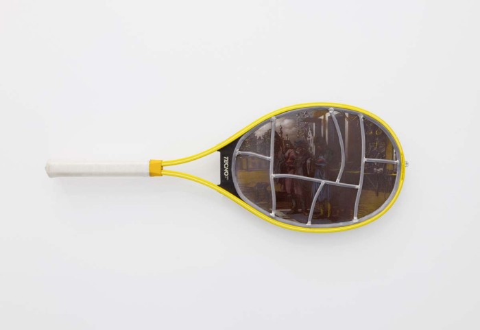 Bender’s People in Pain (1988) isolates film titles and presents them as backlit vinyl wall sculptures, Bickerton’s Seascape: Floating Costume to Drift for Eternity III (Elvis Suit) (1992) frames an Elvis style jump-suit in a futuristic waterproof container, and Delvoye’s Tecno Pro TPS Esprit SL 41-8 Yellow (1989) takes a high tech carbon fibre tennis racket and replaces the strings with a stained glass image of a medieval laborer and patron. By using graphic motifs as his readymade, Lasker’s painting, To Caress the Naked Eye (1987) literalizes the processes of abstraction utilized by Bender, Bickerton and Delvoye.