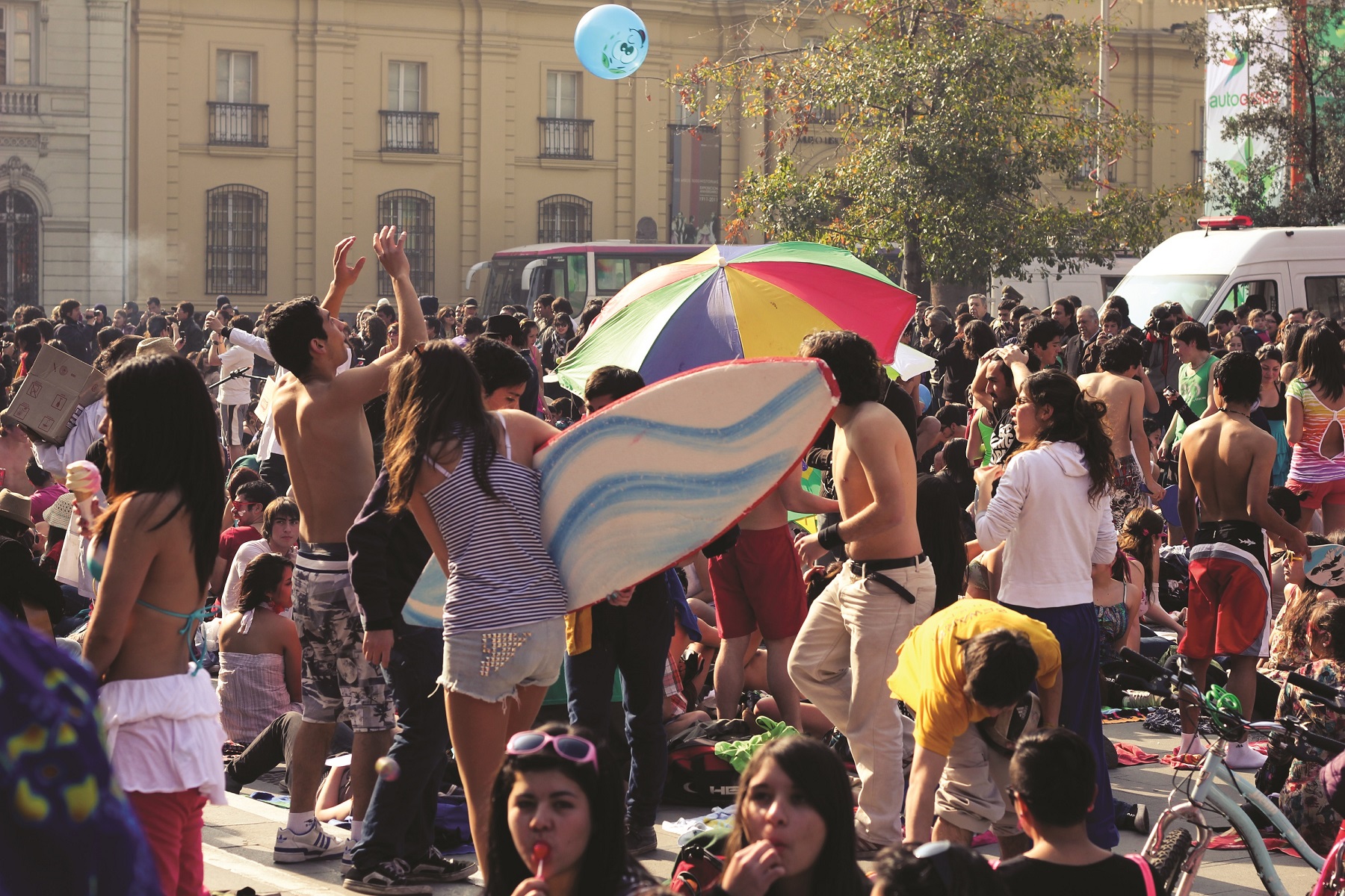 Junto con recuperar la memoria combativa de Sudamérica, se observa una apropiación de referencias ligadas a la publicidad y la industria del espectáculo. Varios y masivos flashmob tuvieron lugar en el centro de la ciudad de Santiago de Chile durante el año 2011, proponiendo acciones simples en las que cualquiera pudo participar y que iban desde besarse hasta suicidarse colectivamente en nombre de la educación (inclusive un evento en facebook promovió una Masturbatón que no llegó a realizarse, al menos públicamente). A diferencia del contexto norteamericano donde estas intervenciones surgen ligadas al comercio y la industria del entretenimiento, los flashmob locales muestran una orientación más política al ironizar sobre la impericia mostrada por las autoridades frente a las demandas estudiantiles. El día 5 de julio de ese año cerca de seiscientas personas recrearon un día de playa en la plaza de Armas de Santiago como respuesta a la medida adoptada por el ministro de Educación del gobierno de Sebastián Piñera, Joaquín Lavín Infante, de adelantar las vacaciones de invierno con el fin de menguar los paros (como se conoce al cese de las actividades académicas) y las tomas (la ocupación total de los establecimientos), que a esa fecha sumaban más de doscientos cincuenta y que para fin de ese mes se habían radicalizado.[1] A La playa de Lavín, como se llamó el evento en alusión a una de las iniciativas más divulgadas de su gestión como alcalde el año 2002, [2] llegaron estudiantes secundarios de liceos pertenecientes al sistema público quienes en bañador y toalla bajo un frío sol de invierno exigieron la renuncia del ministro y de paso criticaron con afinada ironía el estilo populista y espectacularizado de hacer política que representa Lavín.